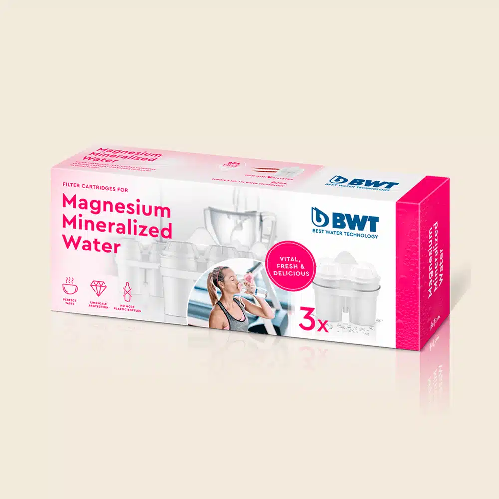 1 pakke med 3 filtre til BWT filterkanden, som fjerner kalk samt stoffer som bly og kobber og tilfører magnesium til vandet. Det betyder, at vandet smager mere friskt.