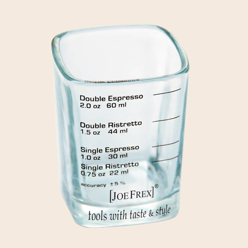 Joe Frex Målebæger med mål til ristretto, dobbelt ristretto, espresso og dobbelt espresso til gavn for både nybegynderen og den mere erfarne kaffenørd.