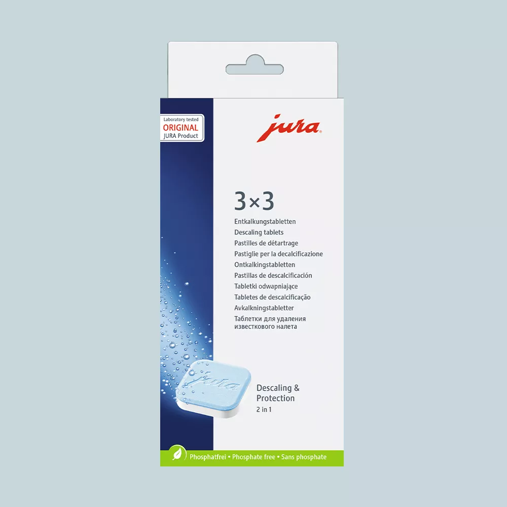 Jura’s privatmaskiner skal bruge 3 stk. tabletter pr. afkalkning. Professionelle maskiner bruger mellem 3 og 6 tabletter pr. afkalkning alt efter maskine – se maskinens manual for at finde ud af, hvor mange netop din maskine bruger.