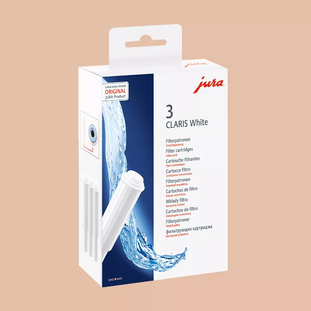 Jura Claris White vandfiltrene filtrerer og blødgør vandet i vandtanken og skåner dermed din Jura espressomaskine for kalk. Din Jura kaffemaskine “kender” vandfilteret (Claris White) og giver dig automatisk besked, når det er tid til at skifte vandfilteret.