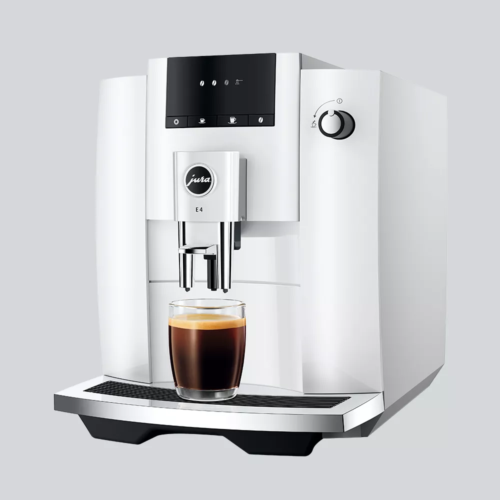Jura E4 i farven Piano White er en enkel og simpel fuldautomatisk kaffemaskine til alle, der elsker de sorte kaffevarianter og har behov for at kunne lave varmt vand.