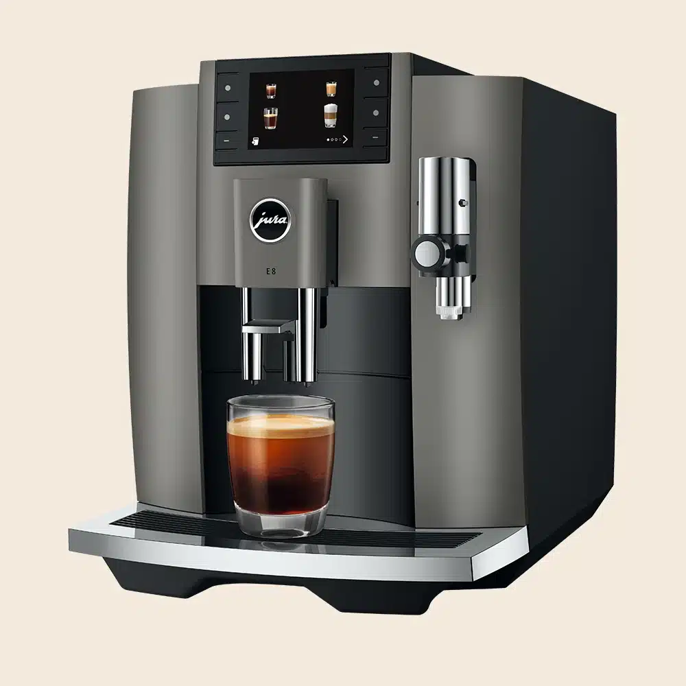 Den populære Jura E8 (EC) er Juras mest solgte espressomaskine til privat brug. Med sit strømlinede design, brugervenlige display og gennemførte kvalitet er den en af de bedste fuldautomatiske espressomaskiner til prisen.