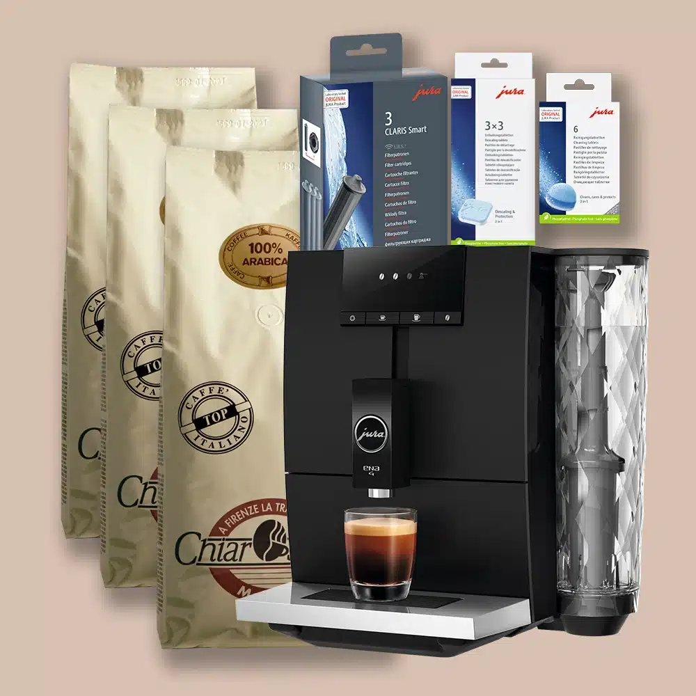 Med dette tilbud på Jura Ena 4 Metropolitan Black får du 3 kilo gourmetkaffe og plejeprodukter til en værdi på 1.338 DKK.