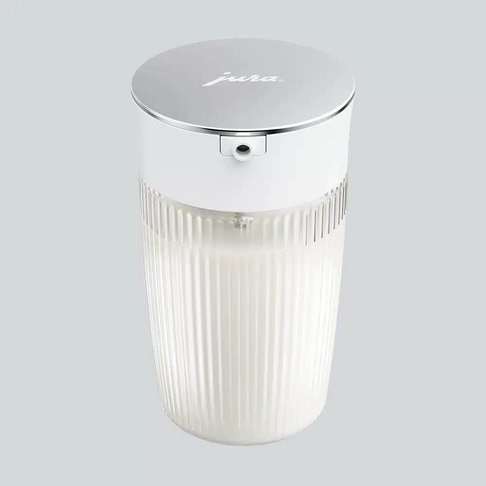 Juras nye glasmælkekaraffel er både praktisk og elegant. Den kombinerer stil og funktionalitet, og er det perfekte supplement til din JURA kaffemaskine. Med sin æstetiske udformning og praktiske detaljer er den designet til at opbevare din mælk – eller plantebaserede drik – på en smuk og funktionel måde.