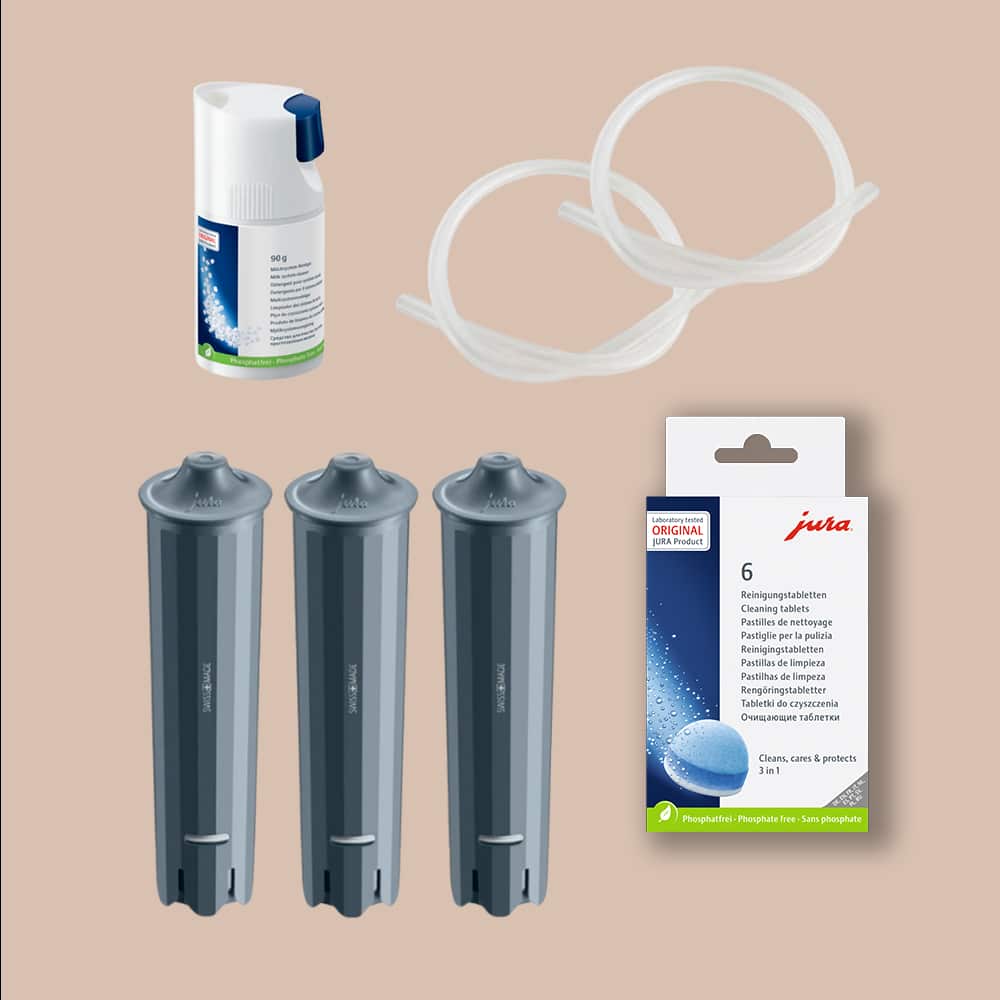 Med plejepakken sparer du penge og får samtidig alle de nødvendige produkter, der kræves for at vedligeholde din Jura espressomaskine.