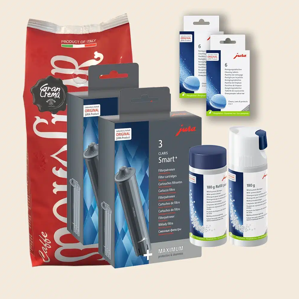 Her er tilbudspakken med de plejeprodukter, du har brug for, når du nyder kaffe med mælk brygget på din Jura espressomaskine.