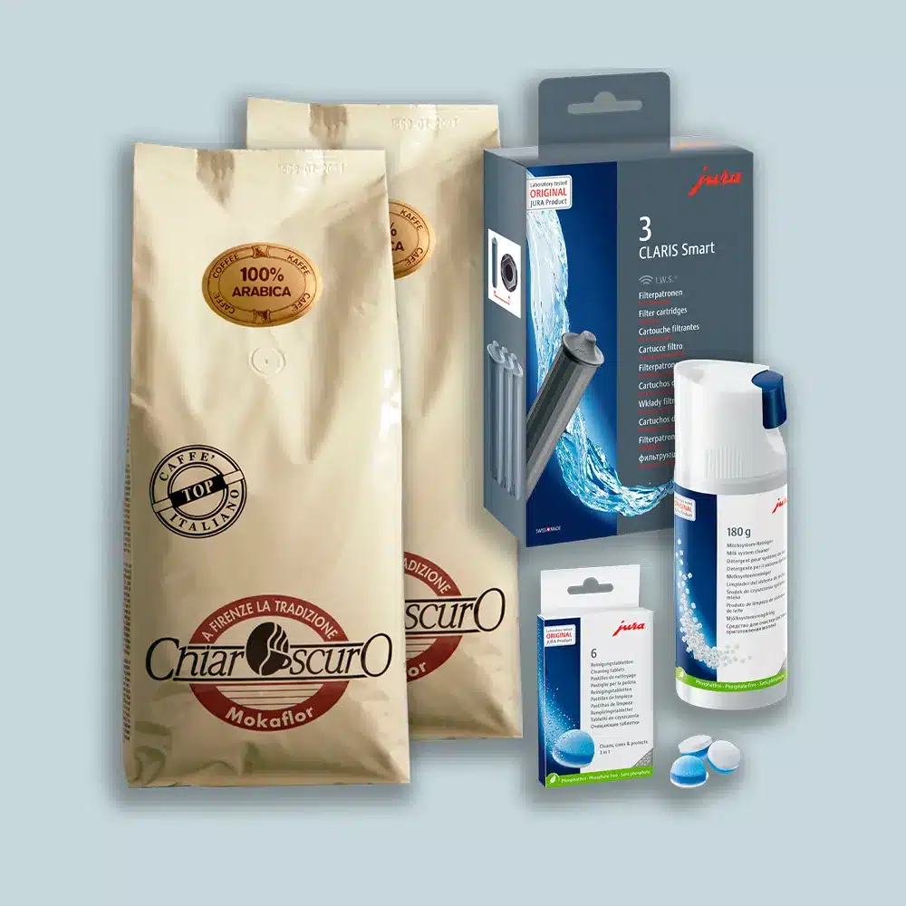 Pakken indeholder de 3 mest essentielle Jura-plejeprodukter samt to kg af vores friskristede, bestseller gourmetkaffe fra italienske Mokaflor.