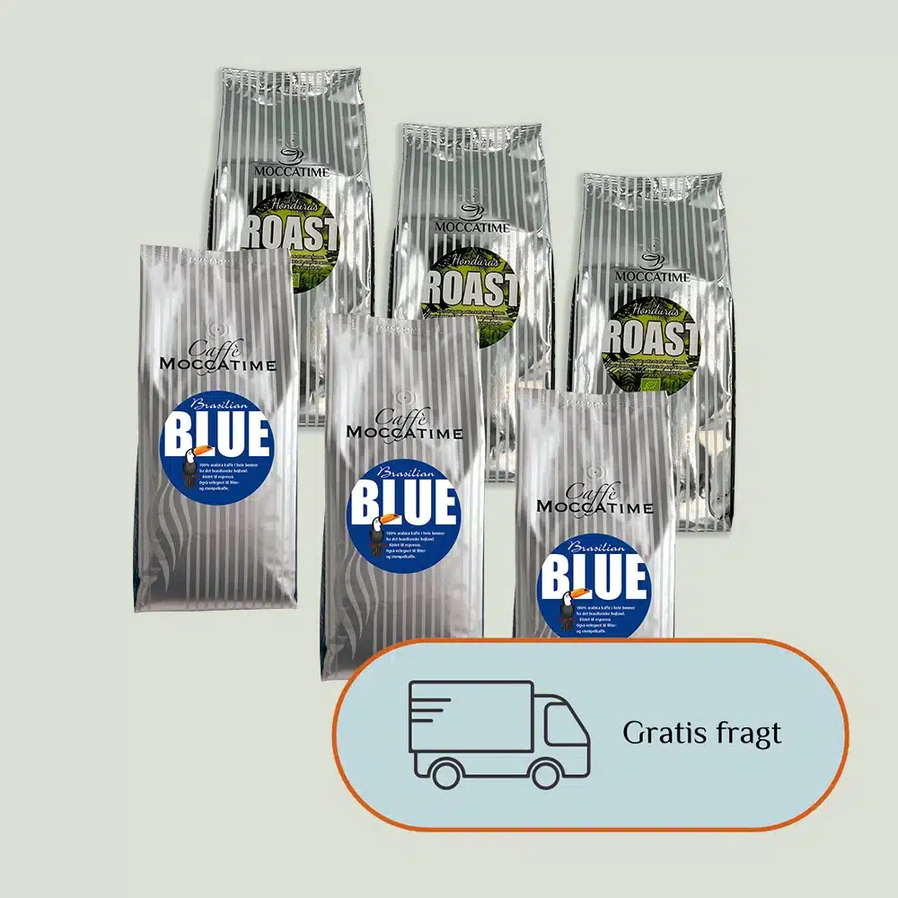 Moccatime Mix-pakken indeholder to favoritter fra vores “Moccatime”-linje: Honduras Roast og Brasilian Blue – begge 100% Arabica. Honduras Roast er en økologisk kaffe fra de højtliggende og frodige områder i Marcala, Honduras, mens Moccatime Brasilian Blue er en single origin-kaffe fra det brasilianske højland. Du får 3 kg af hver type, så du kan finde din personlige favorit.