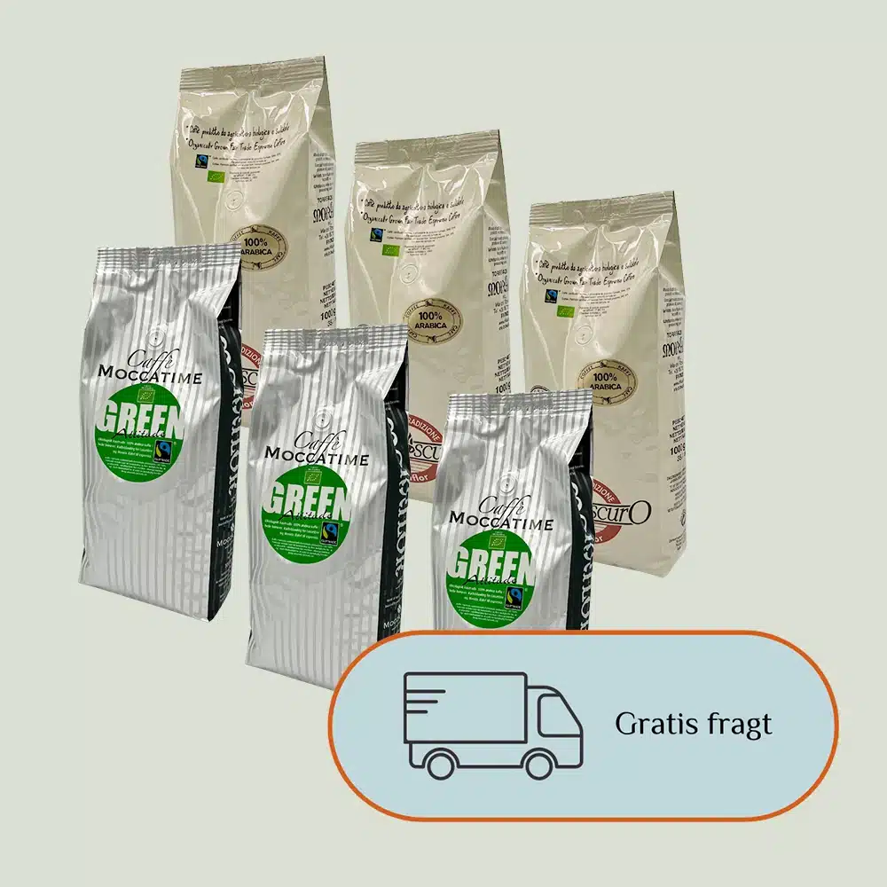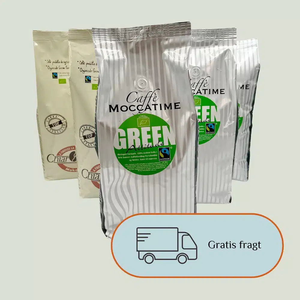 Med en økologisk kaffepakke fra Moccatime får du hele 6 kg friskristede kaffebønner til en rigtig favorabel pris. Pakken består af 3 kg Moccatime Green Attitude, 100% Øko Fairtrade Arabica og 3 kg Chiaroscuro, Økologisk Fairtrade, 100% Arabica.