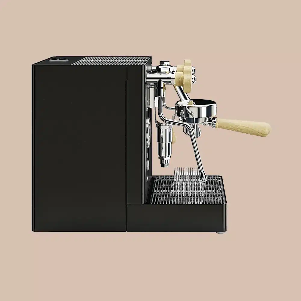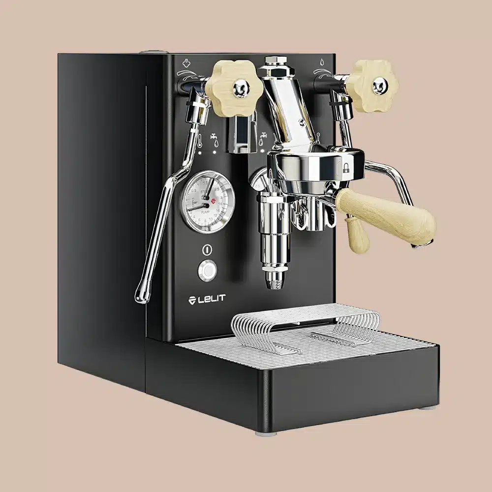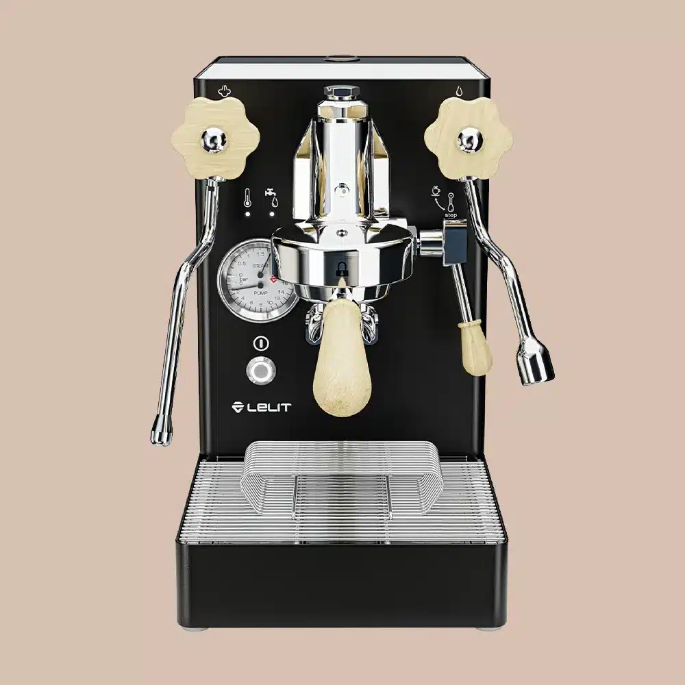 Den helt nye Lelit MaraX V2 espressomaskine i sort med alle greb i lyst ahorntræ. Mara X har naturligvis stadig sit smalle design, det legendariske E61 bryggruppehovede og indbygget 3-trins PID-styring.