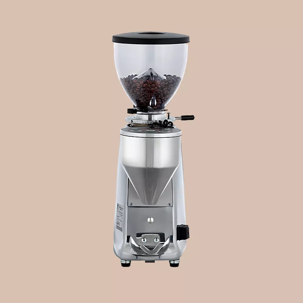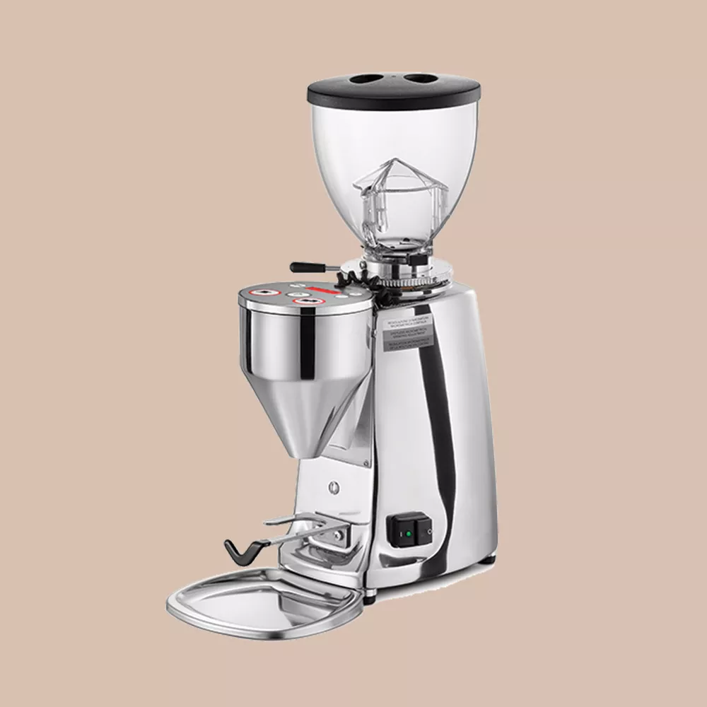 Professionel Mazzer kaffekværn i poleret aluminium med mikrometrisk kværnjustering til hjemmebrug, som kværner direkte ned i filterholderen.