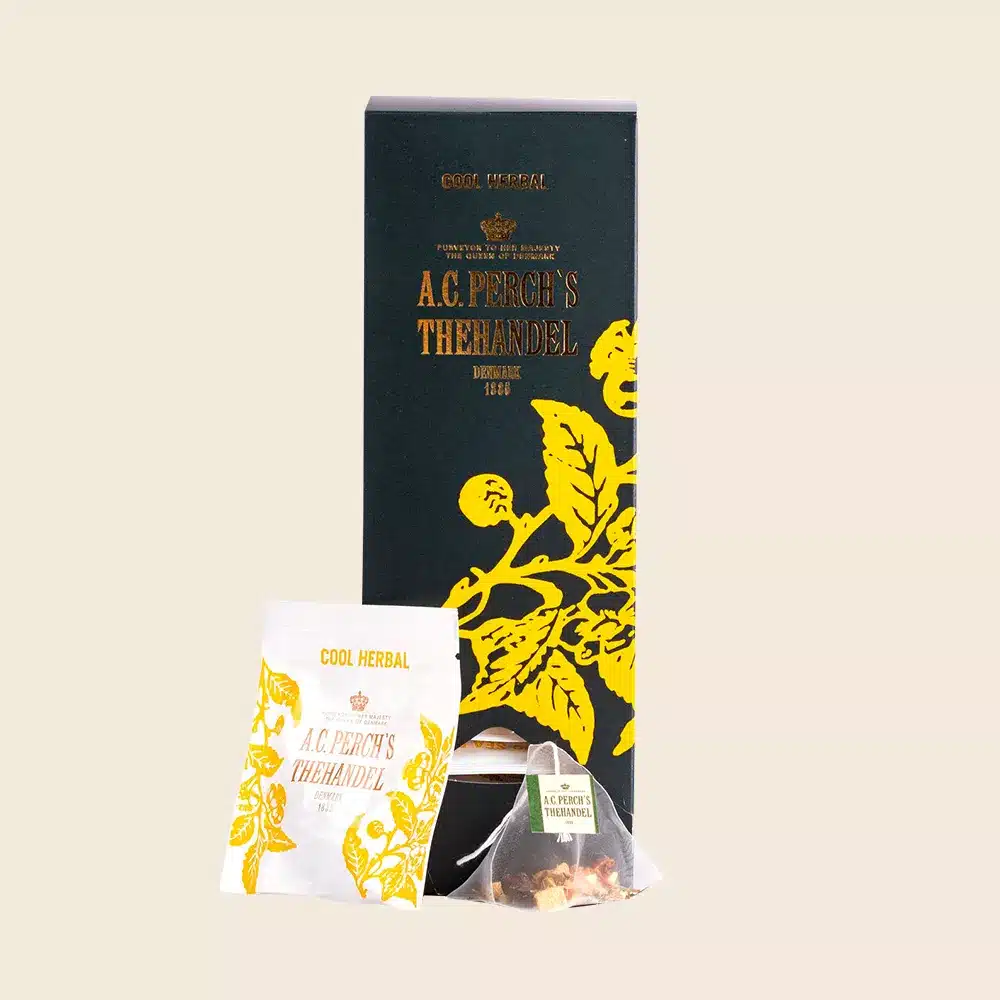 Få en frisk smag i din kop med Perch’s Cool Herbal. Delikat urtete med lakridsrod, pebermynte, æblestykker og citrongræs.