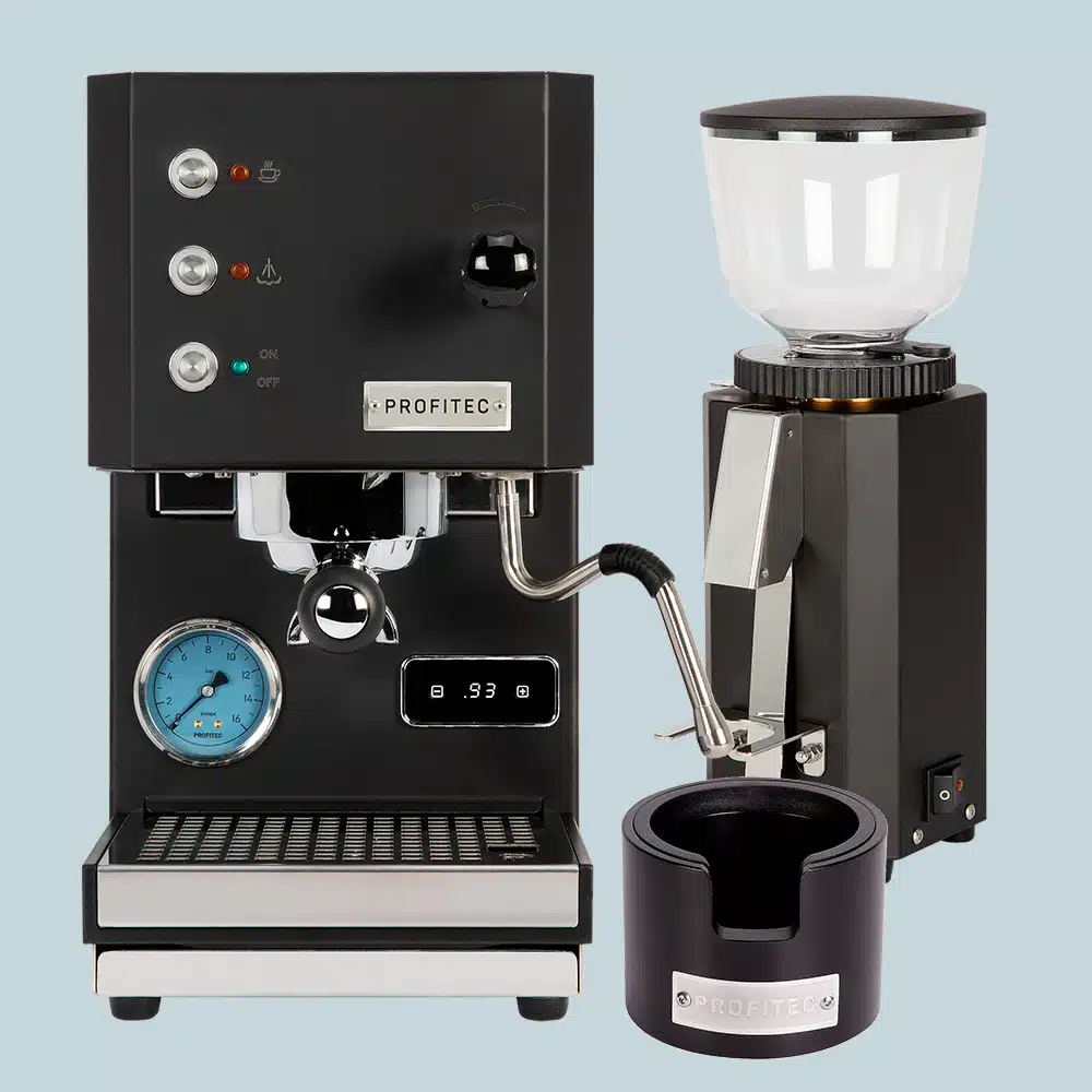 Tilbud med Profitec GO i sort. Få den populære Profitec GO, den kompakte kværn, Profitec Pro M54 samt en elegant tamperstation i dette lækre sæt fra tyske Profitec. Det er til dig, der elsker god kaffe og værdsætter æstetik. Både espressomaskine og kaffekværn er i mat sort finish og passer perfekt sammen.