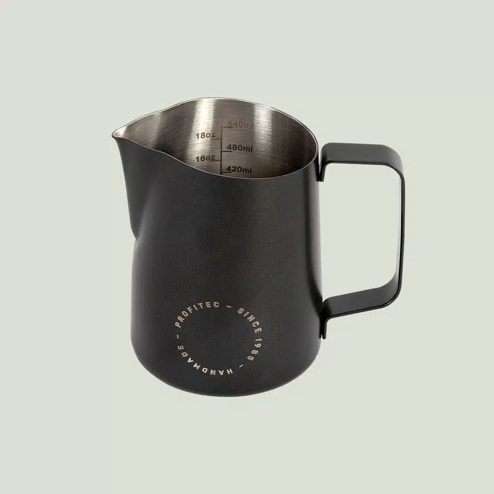 Dens sorte coating gør mælkekanden til det oplagte tilbehør til eksempelvis den sorte Profitec GO og Profitec MOVE.